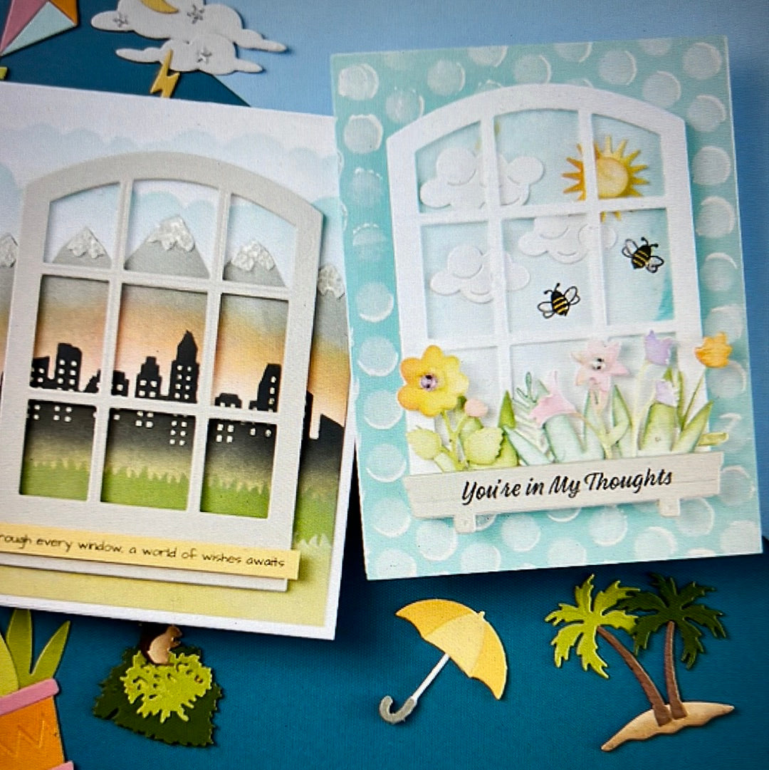 Windows with a View is a collection of wonderful scenery one can observe through a window. There are scene sets, clear stamp sentiments and a background stencil that enhances the S5-626 Vista View Window set. What do you see out your window?